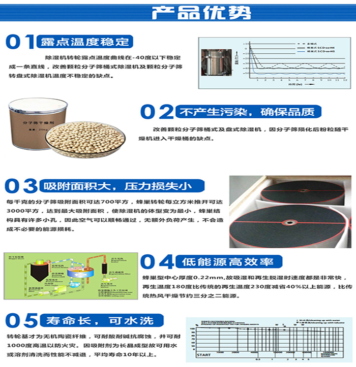 蜂巢轉(zhuǎn)輪的主體由陶瓷纖維及有機添加劑制成之陶制蜂巢構(gòu)成,再以分子篩及矽膠為基本材料經(jīng)高溫結(jié)晶燒結(jié)使之表面堅硬并強力吸附于蜂巢內(nèi)部,故不會如同一般筒裝或轉(zhuǎn)盤式分子篩因老化后產(chǎn)生粉粒隨干燥風吹入干燥桶污染塑料,而且蜂巢轉(zhuǎn)輪之壽命無限制又可以清洗,不像一般分子篩易于飽和或老化必須經(jīng)常更換,潮濕回風穿過蜂巢轉(zhuǎn)輪的無數(shù)小孔時水分將迅速被分子篩吸收,故當它離蜂巢時已被完全除濕并達到非常低之露點的干燥風,再生與除濕原料相似而且同時進行,只是再生風流向相反。